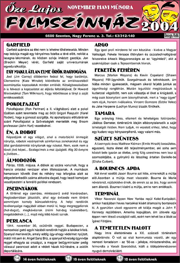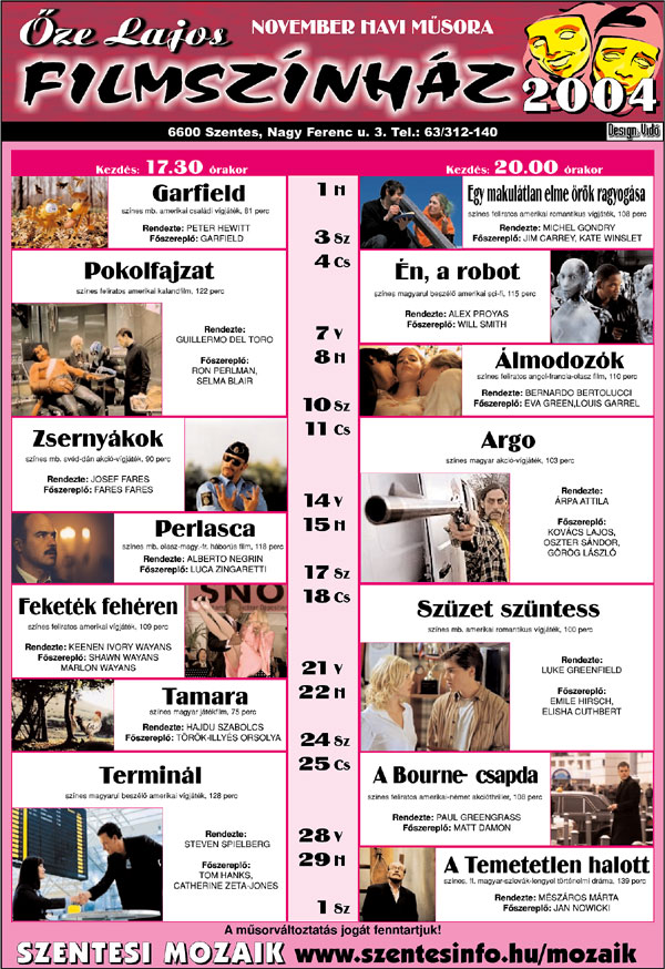 Őze Lajos Filmszínház 6600 Szentes, Nagy Ferenc u. 3. Tel.: 63/312-140
