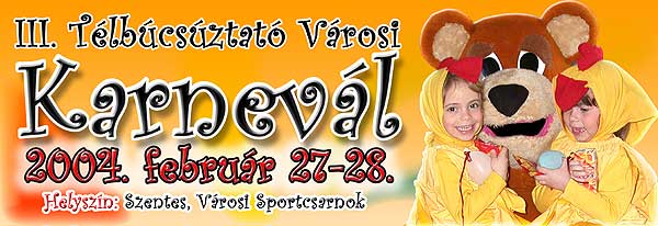 A délelőtt a jelmezesek jelmezversenyével fog eltelni, és délután elindul a Karnevál Karaván, ami a Kossuth utcán vonul végig egészen IH melletti gödörbe, ahol is egy hatalmas tábortűzzel fogjuk közösen elűzni a telet. Az este során kerülnek kiosztásra a jelmezverseny díjai és egy kicsit belekóstolhatunk az afrikai hangulatba az Afro-magic Band-el, és végül a megszokott lufieső zárja a III. Télbúcsúztató Városi Karnevált. Szentes, 2004. 02. 27. |
