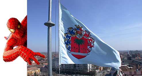 2004. február 28-a Szentes történelmébe a III. Télbúcsúztató Városi Karnevállal vonul be, de ezen a napon nemcsak maci, sárkány, nyuszi és megannyi állati jelmezbe bújt maskarást, lehetett látni hanem a Városháza tornyán pókember járt. A hideg időre való tekintettel ipari alpinistának öltözött, és lecserélte a szélfoszlatta lobogót. Szentes, 2004. 03. 04. |