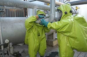 Az ammónia igen rossz élettani funkciókkal rendelkezik, és belélegzése torokbénuláshoz is vezethet. A cseppfolyós ammónia pedig fagyási azaz, égési sérüléseket okoz, ezért nagyon fontos a körültekintő veszélyhelyzeti elhárítás. Az első gyakorlati napon egy feltételezett csőrepedést hárítottak el a vegyvédelmi ruhába öltözött tűzoltók, majd a kollégák méréseket végeztek a rendszer körül. Amíg a csőszakaszra bilincset helyeztek, addig is imitált vízköddel próbálták megakadályozni a kollégáik, hogy a kiáramlott ammóniafelhő tovaszálljon. A gyakorlat sikerült, de ezzel még nem ért véget.