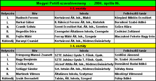 Szűcs Lajos alpolgármester nyitotta meg 2004. április 6-án a Petőfi Sándor Általános Iskolában az alsó tagozatos Megyei Petőfi Szavalóversenyt.
