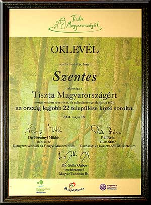 Több száz városlakó vette a fáradtságot, így az ügyben illetékes Közterület-felügyelet is, hogy nagytakarítás történjen Szentesen. Az elért eredmény mellett a lakosok fáradozását az illetékes szakminisztérium az alábbi oklevéllel jutalmazta, amin olvasható, hogy városunk a Tiszta Magyarországért mozgalomban bekerült a legjobb 22 település közé. Gratuláció mindenkinek, aki részt vett az akcióban, aminek folytatása hamarosan következni fog! Szentes, 2004. 05. 21. |