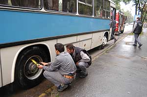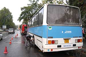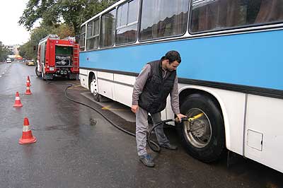 A tűzoltók két fecskendővel közel 20 percen át hűtötték a hátsó tengelyeket, amíg meg lehetett azt műszakilag közelíteni. Szentes, 2004. 09. 30. |