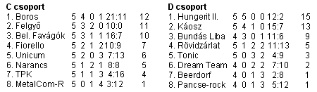 C Góllövő lista: 7 gólos, Szabó László (Boros); 6 gólos, Lekrinszki Árpád (Bel. Favágók); 5 gólos, Szeri László (Boros), Horvát László (Fiorello). D Góllövő lista: 7 gólos, Szeles Ádám (Káosz); 4 gólos, Szabó Kornél (Bundás Liba).