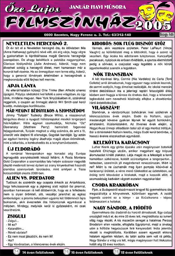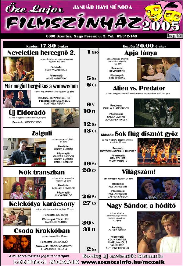 Őze Lajos Filmszínház 6600 Szentes, Nagy Ferenc u. 3. Tel.: 63/312-140