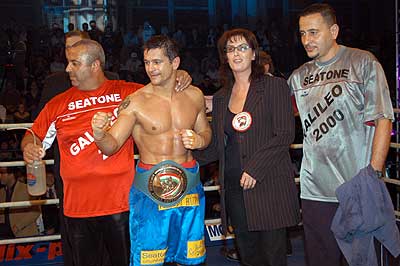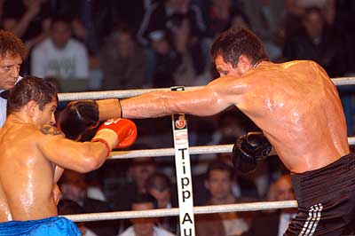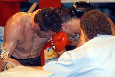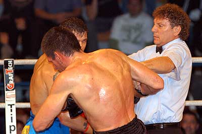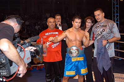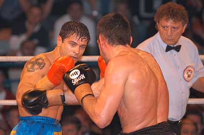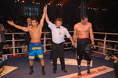 Kék sarokban a kihívó: Halász Gábor (piros kesztyű) Piros sarokban a címvédő: Popovics Tamás (fekete kesztyű)