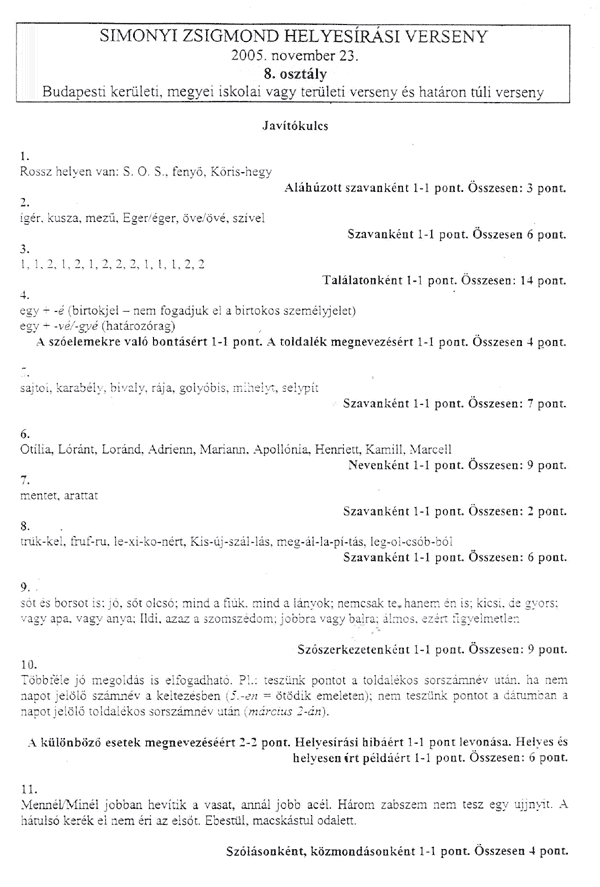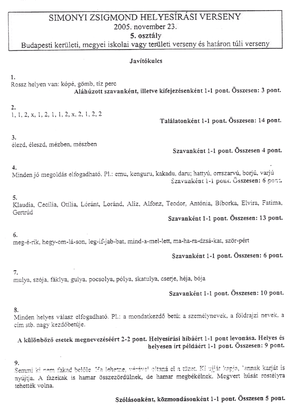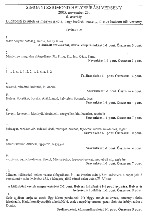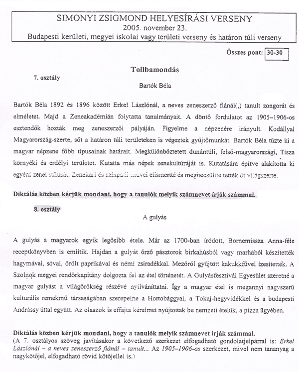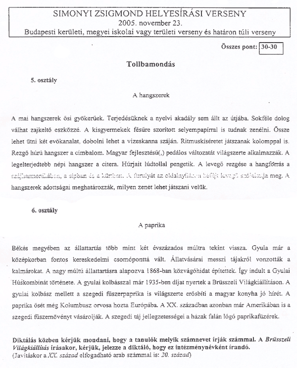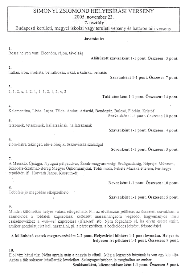 A tollbamondás és a feladatlap kitöltésekor a következőkre kellett vigyázni a versenyzőknek: • Csak a magyar helyesírásnak megfelelő ékezetet fogadják el (karika, vízszintes egyenes . . . ) • Egyértelműen kell megkülönböztetni a kis és nagy kezdőbetűket, az ékezetek rövidségét és hosszúságát, illetve az egybe- és különírást! A félreérthető alakokat nem fogadják el! • Az a versenyző, aki mást ír, mint amit diktáltak, szavanként egy-egy pontot veszít.