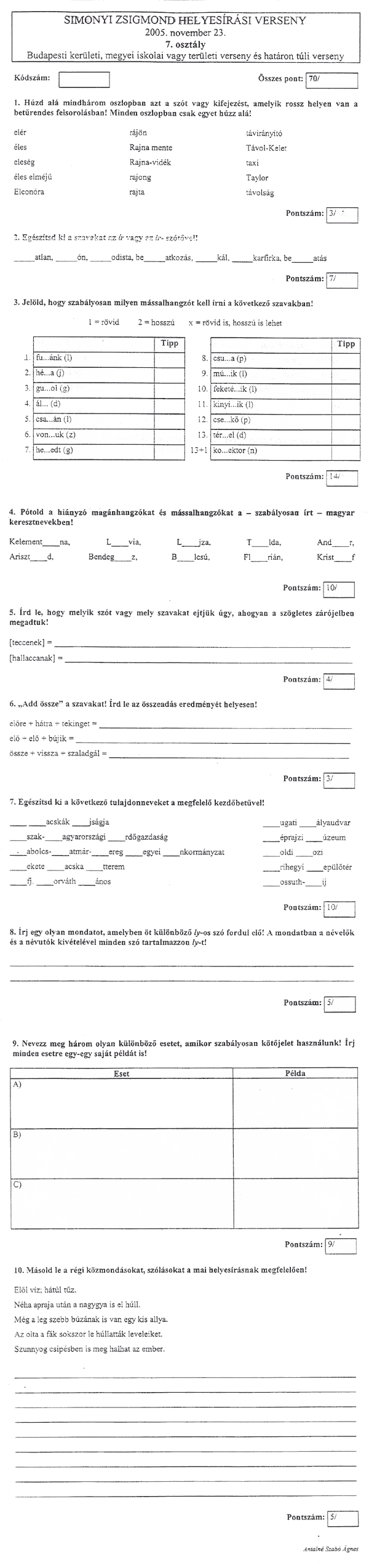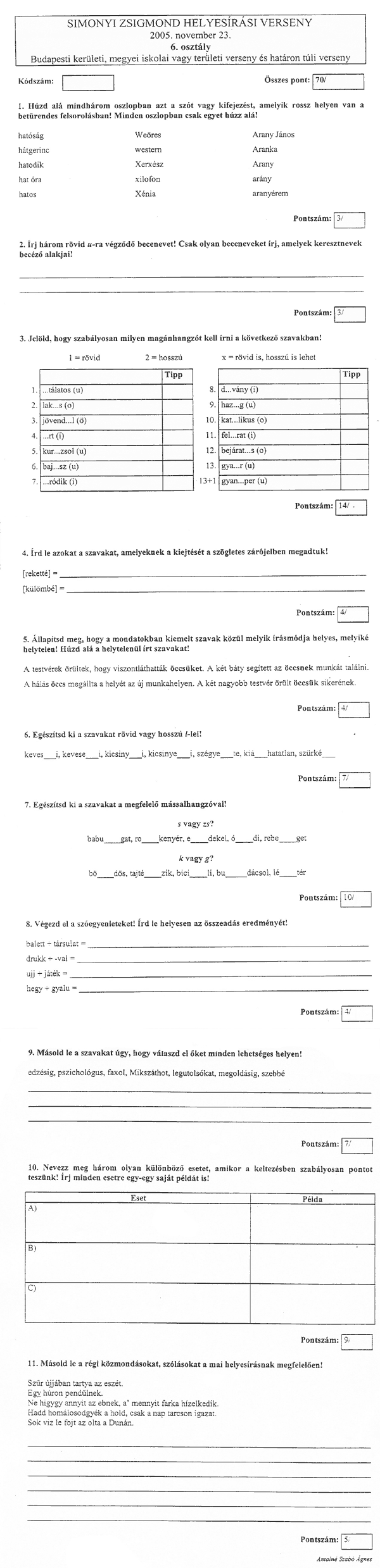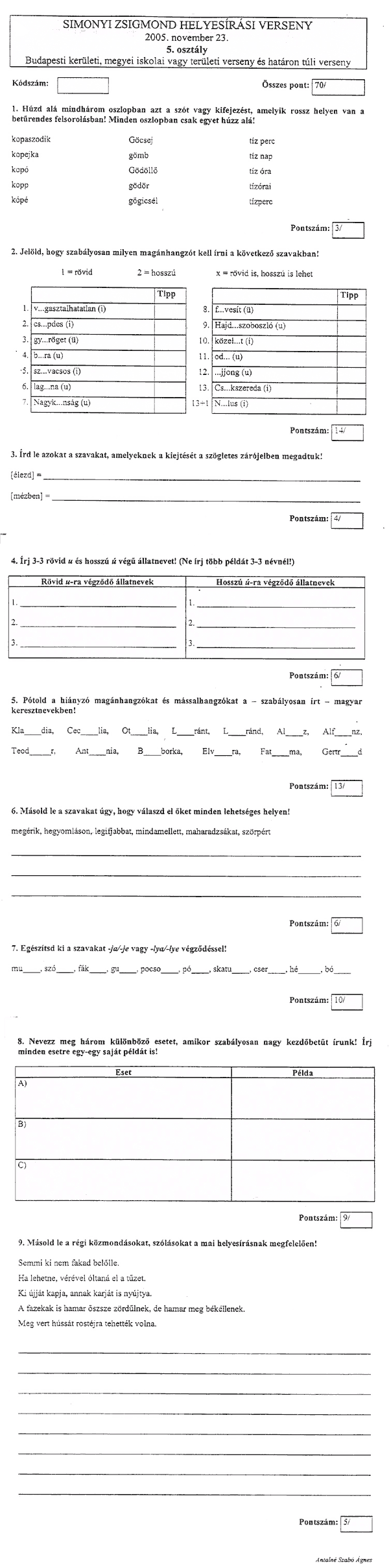 A tollbamondás és a feladatlap kitöltésekor a következőkre kellett vigyázni a versenyzőknek: • Csak a magyar helyesírásnak megfelelő ékezetet fogadják el (karika, vízszintes egyenes . . . ) • Egyértelműen kell megkülönböztetni a kis és nagy kezdőbetűket, az ékezetek rövidségét és hosszúságát, illetve az egybe- és különírást! A félreérthető alakokat nem fogadják el! • Az a versenyző, aki mást ír, mint amit diktáltak, szavanként egy-egy pontot veszít.