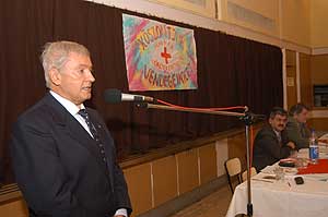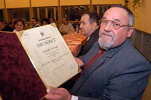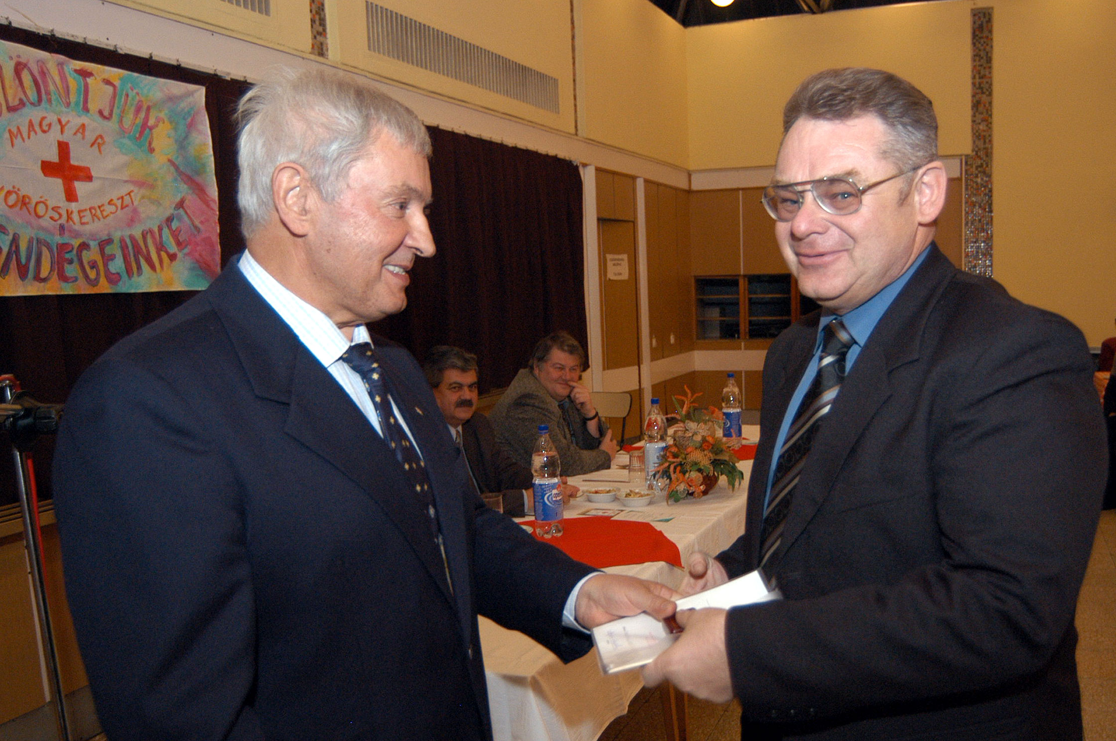 Török József Király József Eddig 120 alkalommal nyújtotta a karját Török József. Ebből az alkalomból nemcsak a szentesi ünnepségen vehetett át jutalmat, hanem Rácz Jenő egészségügyi miniszter is elismerte önzetlenségét. Király József pedig 100-szoros véradásért vehetett át oklevelet és jelképes jutalmat. Szentes, 2005. 12. 10. |