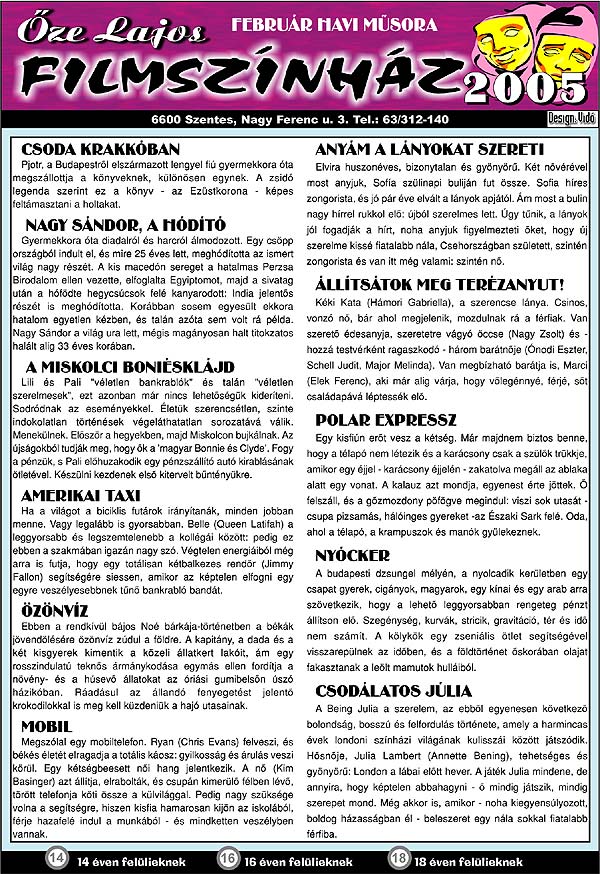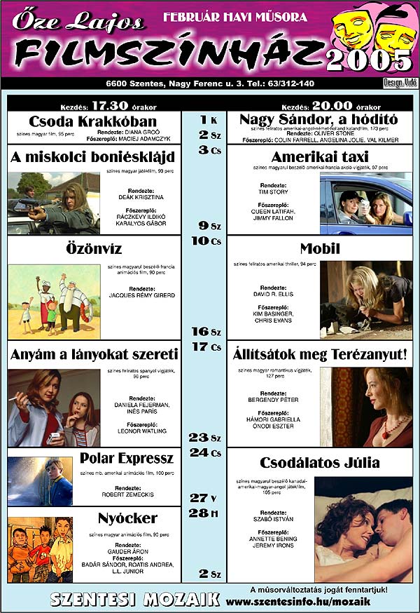Őze Lajos Filmszínház 6600 Szentes, Nagy Ferenc u. 3. Tel.: 63/312-140