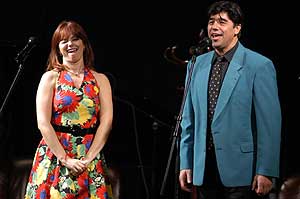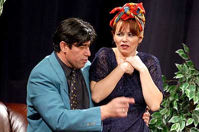 A művészek egy átlagos pár életútját mutatták be a megismerkedéstől a lánykérésen át a házasság végórájáig. A művésznő jelmezei is követték az előadásbeli idő múlását. Előbb fehér báli ruhában jött, majd kisestélyiben, később kendővel a fején, közben előadásbeli férje táblával a nyakában követelt egyenrangúságot. A két művész szerelmes dalokba öntötte a párkapcsolat szépségeit, gyötrelmeit. Szentes, 2005. 02. 11. |