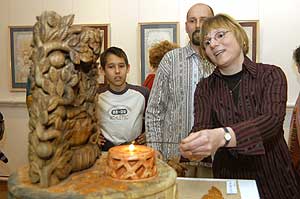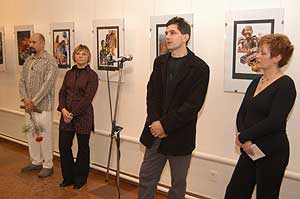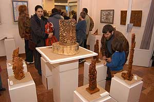 Most pedig ismerjük meg a három kiállítót: Horváth Sándor - 1966. 12. 06-án születtem Szentesen. Azóta is itt lakom, itt élek. Egy műszaki szakközépiskolába jártam, de a műszaki dolgok nemigen érdekeltek. Mint később kiderült, a humán tárgyak, a mű-vészetek sokkal inkább vonzottak. Iskoláim nincsenek, Mestereim vannak. Közülük is talán Hamvas Béla (író, esszéista, 1896-1968) gyakorolta rám a legnagyobb hatást, mind életével, mind írásaival. 18 éves koromtól veszek részt kiállításokon. Kezdetben sokáig csak grafitceruzával készült rajzok-kal, majd színes rajzokkal, gipszből faragott maszkokkal és figurákkal. Fafaragással 2000 februárja óta foglalkozom. Akkor kaptam kezembe fafaragó Mesteremtől az első darab olyan fát, amivel már tudtam mit kezdeni. Nem tanultam sem rajzolni, sem faragni. Nem másolok. Mindent, amit alkotok lelkemből, és szellememből gyúrom az anyagba, a fantáziám segítségével.