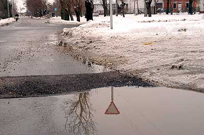 Az útjavítás egyik oldala. Hamarosan várható, hogy eljön a tavasz, de ennek az átmeneti időszaknak nem igazán örülnek a Boros Sámuel utca elején lakók, mert a fenti képen is látható, hogy a csatornázási ideiglenes útjavítás gátat emel a hólé lefolyásának. Az itt lakók arról panaszkodtak, hogy az udvarból nem hogy ki, hanem inkább befolyik az olvadó hó, mert a szennyvízcsatorna hálózatának építésekor az útjavítást úgy végezték el, hogy kb. 4-5 cm-rel (mint egy fekvőrendőr) kiemelkedik az út szintjéből a javítás.