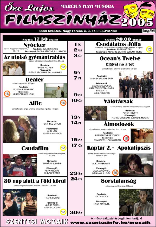 Őze Lajos Filmszínház 6600 Szentes, Nagy Ferenc u. 3. Tel.: 63/312-140