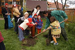 Nagy kedvvel végezték a kicsik a kerti munkát, és segítettek a kisfa elé elhelyezni azt a közel 30 éves emlékfatörzset (30 évgyűrű számolható meg rajta), mely tartja a táblát és ezáltal hirdeti, hogy a mögötte álló csemete minek az örömére lett elültetve.