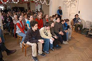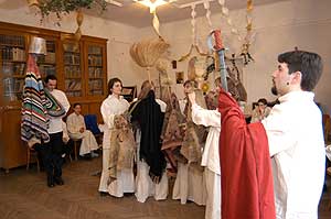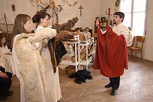 A szabadkai fiatalok érkezése után a Városháza dísztermében fogadta őket Szirbik Imre polgármester, aki tájékoztatást adott a Szentes jelenéről és múltjáról. E rövid protokolláris program után a szentesi parókia előadótermében adták elő a szabadkai fiatalok a János vitéz - bábjátékot, tárgyjátékot. Első pillanatra furcsa volt a szereposztás, de gyorsan megszokható volt, hogy a hétköznapi tárgyak, melyekkel nap, mint nap találkozunk és használjuk őket emberi, azaz mesebeli szerepet kaptak. A válogatás könnyen történt, mert egy harminc éve nem lomtalanított padlás elég volt ahhoz, hogy összeválogassák a mű főszereplőit. Szentes, 2005. 04. 12. |