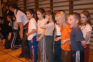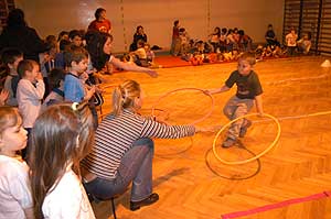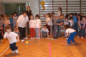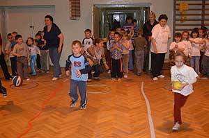 Az "edző" óvónők is hasonló adrenalin növekedésben részesültek, mint a gyerekek, de ők a hétköznapokon megedződtek, így jobban állták a sarat, és sorra dolgozták ki a feladatok megoldásának taktikáját: "Gyorsabban Zolika! Gyorsabban Marcsi!". A győztes csapatot haza ugyan nem "arany gép" szállította, hanem a gyerekek mehettek busszal. Lábbusszal! Szentes, 2005. 04. 25. |