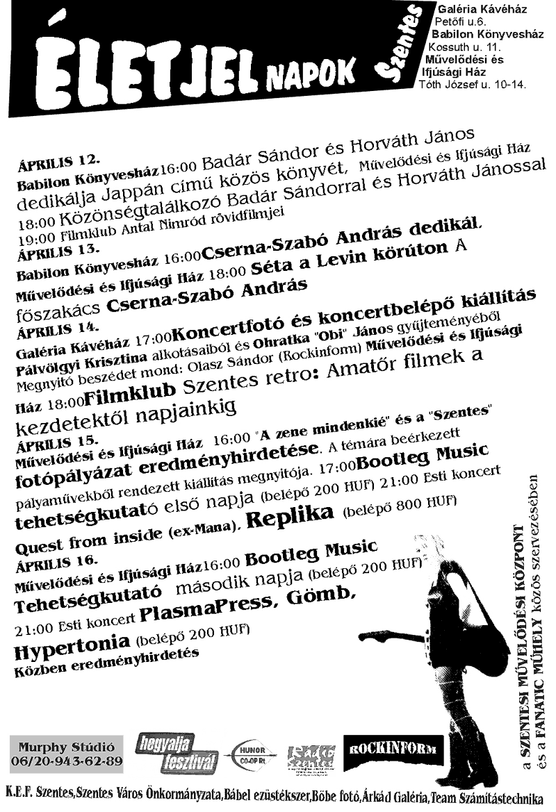 15. (péntek) Életjel napok - 4. nap Részletes program ITT tekinthető meg! „A zene mindenkié” és a „Szentes” c. Bootleg Music tehetségkutató verseny, 17 óra Koncertek (21.00 óra): Quest from insied, Replika Mindhárom program az Ifj. Házban lesz