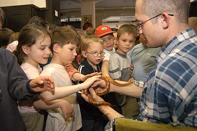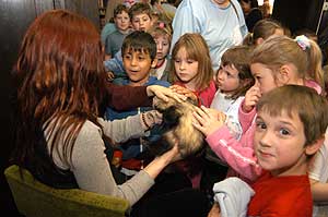 Az előadás végén előkerültek a nyuszik és a gyerekek nem voltak "nyuszik" azokat megsimogatni, de a félsz gyorsan eluralkodott rajtuk, amikor meglátták a gabonasiklót, vagy a vadászgörényt, ami után kiadós szellőztetést kellett tartani. Persze a gyerekek abból az "illatból" semmit nem éreztek mert nagyobb volt az öröm, mint hogy ilyen kis kellemetlenség elvegye a kedvüket. Szentes, 2005. 04. 21. |