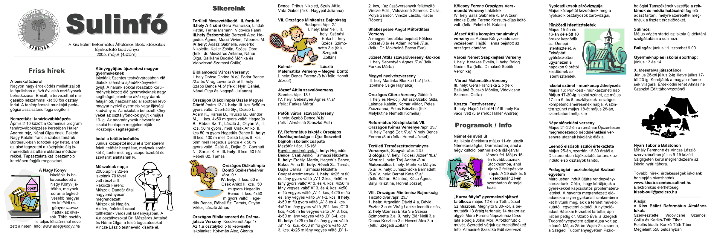 Megjelent a Sulinfo negyedik száma! Megjelent a Kiss Bálint Református Általános Iskola Sulinfo című kiadványának negyedik száma, mely mint egy iskolaújság tölti be azt a tájékoztató szerepet, ami mind a szülőknek mind a diákoknak az iskola mindennapjairól és terveiről ad tájékoztatást.