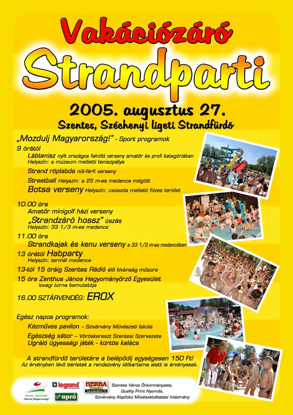 Ezen a hétvégén (2005. augusztus 27.) rendezik meg a Vakációzáró Strandpartit a Széchenyi-ligeti strandon, ahol számos programmal, HAB party-val és a délután sztárvendégével Erox-al várnak mindenkit. Szentes, 2005. 08. 24.
