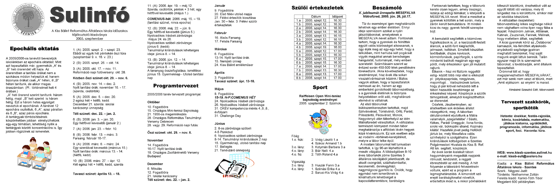 Megjelent a Kiss Bálint Református Általános Iskola Sulinfo című kiadványának 2005. szeptemberi száma, mely mint egy iskolaújság tölti be azt a tájékoztató szerepet, ami mind a szülőknek mind a diákoknak az iskola mindennapjairól és terveiről ad tájékoztatást. Hírek, érdekességek, aktualitások olvashatók az A5-ös méretű kiadványban, amely most már emelt példányszámban az iskola keretein belül kerül terjesztésre, de elérhető az iskola honlapján a www.kissb-szentes.sulinet.hu, valamint a Szentesi Mozaik Internetes Újság hasábjain keresztül is.