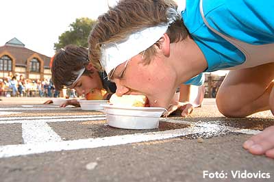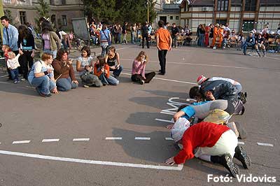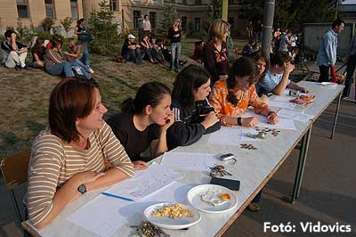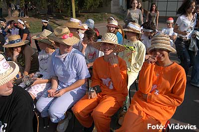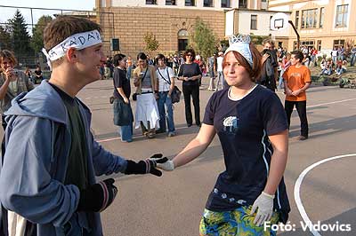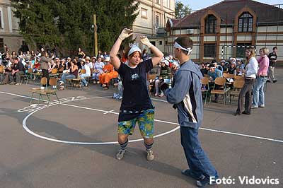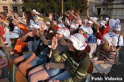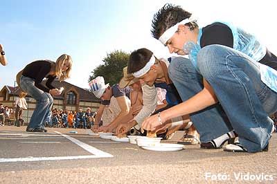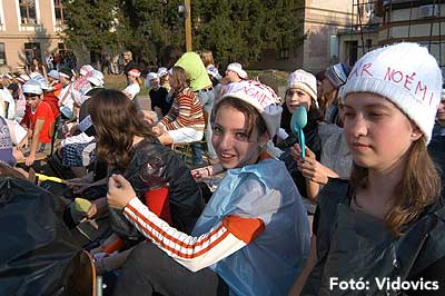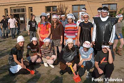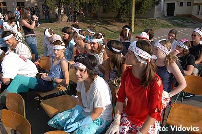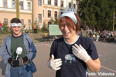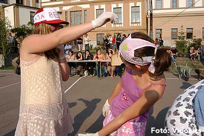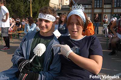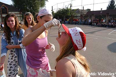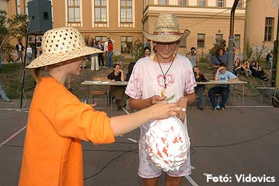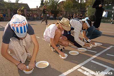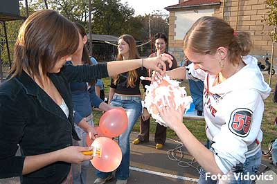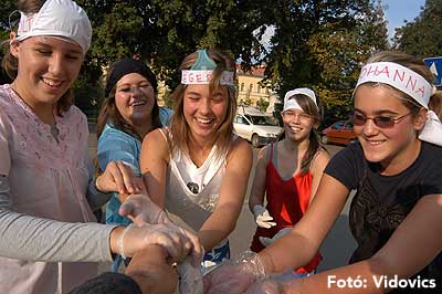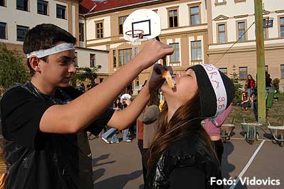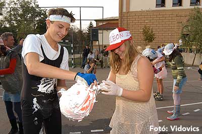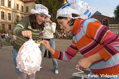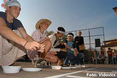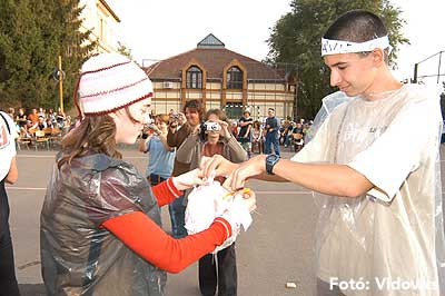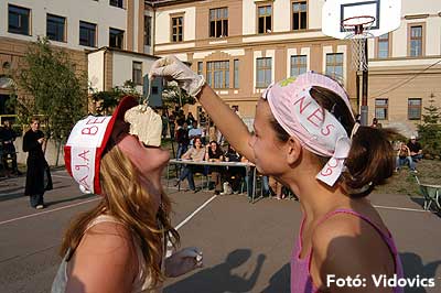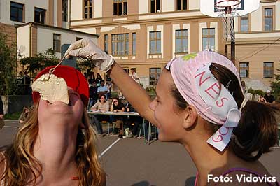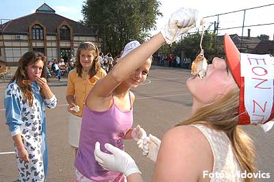 A vízből almaevés, lufi borotválás és "finoman" sózott vajas kenyér evés is szerepelt a feladatok között. A nap végén az Ifjúsági Házban bulival ünnepelték a kisgólyák, hogy nagygólyák lettek, amely bulinak csak az elején voltunk ott, de "hajnalig" ropták a gólyatáncot. |
