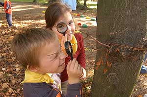 Ezt követően bebarangolták a Széchenyi ligetet, a Kurta partját és játékos felfedezések, pontszerző versenyek tarkították a délelőttöt. A gyerekek állatok képeit válogatták, párosítottak, találós kérdéseken törték kobakjukat, de volt itt mocsárjárás, rókariogatás, fészekrakó játék is. Nagyítókkal, zsebmikroszkópokkal az őszi napon sütkérező bodobácsokat, lusta katicákat, még dolgozó hangyákat vizsgálhattak a gyerekek. Távcsövekkel a fák koronáját, a Kurca túlpartját kémlelték lelkesen felfedezve galambokat, récéket...
