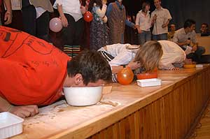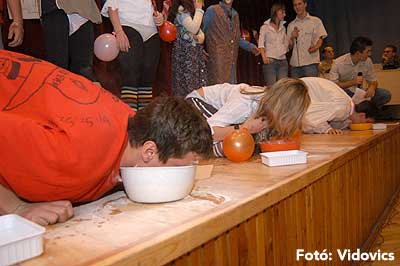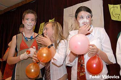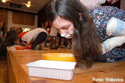 Közben jöttek-mentek a külsős-belsős feladatok, így osztályonként 1-1 fő elsétált a Füsti fagyizóba egy megrendelt csomagért, míg a többiek egy liszttel teli tál aljából halászták ki a csokoládé darabokat.