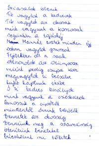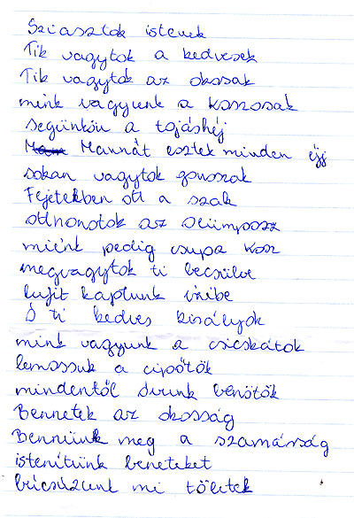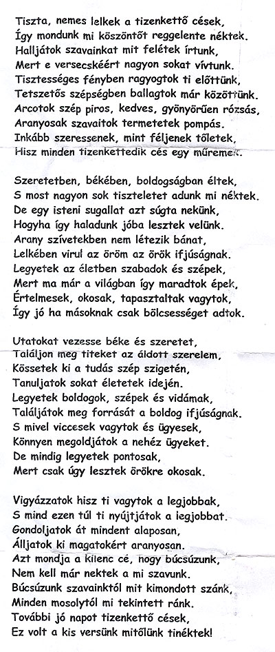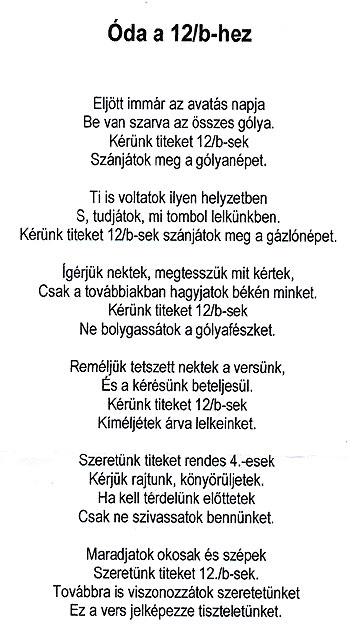 Én .............. 9.-es Boros Gólya, kinek a tudás a mozgatórugója, kiben a büszkeségtől nem hajlik a csigolya, s kire nem hat semmiféle tanári rigolya, elveimet feladom, és most az egyszer fogadom, hogy jelenlétemmel a tanórákat nem zavarom. Egy tanárban sem bízom, kilétem jól titkolom. Elég, ha az érettségin látja, hogy én vagyok a diákja. A gólyák sorsát felvállalom, a felsősöket kiszolgálom. Akármit is kérnek tőlem, szeretettel teljesítem. Örülök, hogy ide járok és Boros diáknak látszok. Ez tüntet fel tök jó színben, hisz én leszek a null null ziben (007). Köszönöm a szervezőknek, hogy most rajtam jót röhögnek, és bár most itt bután állok, mégis a Borosba járok.