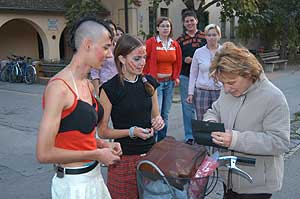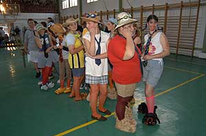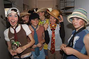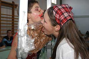 A gólyabál képes összefoglalója ITT tekinthető meg! A szervező osztály több hagyományos feladattal készült az elsőéves tanulók számára, akik próbáltak a legjobb tudásuk szerint helytállni. A feladatok között először össze kellett énekelni az utcán az osztálypénzt, majd folpackról kellett lenyalni mogyorókrémet. A bundás kenyér sütést is "gyorsan" végrehajtották az osztályok. Szentes, 2006. 10. 16. |