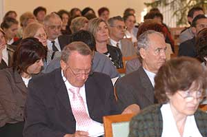 A rendezvény témája: Új lehetőség a rosszindulatú daganatok kezelésében – molekulárisan célzott terápia. Azon új gyógyeljárásokról volt szó, melyeket 10 éve még csak elméleti lehetőségként ismertek, de mára alkalmazásuk már a mindennapok részévé vált. Lényegük, hogy az eddig ismert kemoterápiás módszerekkel együtt alkalmazva ezen új gyógyszerekkel, a kezelés hatékonyabbá válik, mert célzottan a daganatsejtek ellen irányul. Ezen gyógyszerek tulajdonképpen különböző daganatsejt-alkotórészek ellen ható antitestek, melyek képesek megállítani a daganatsejtek osztódását. Jelenleg emlődaganatok, béldaganatok és bizonyos vérképzőszervi megbetegedések kemo-immunterápiája hozzáférhető a napi orvosi gyakorlat számára. Szentes, 2006. 10. 22. |
