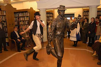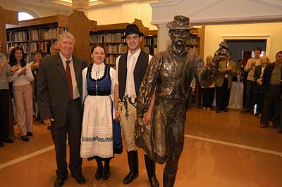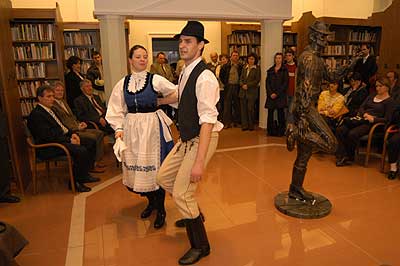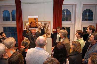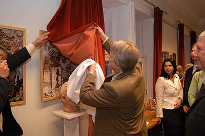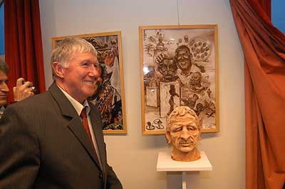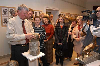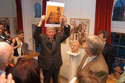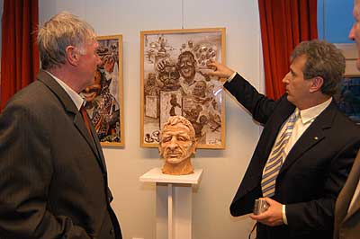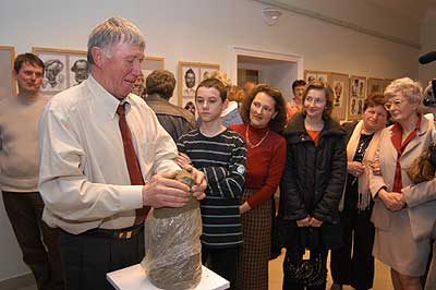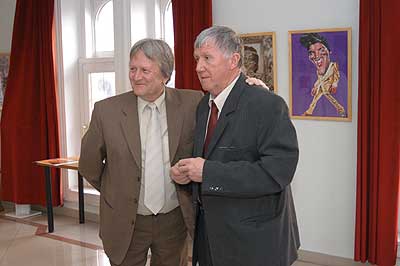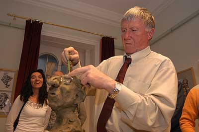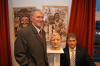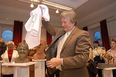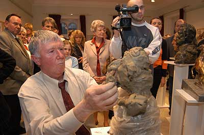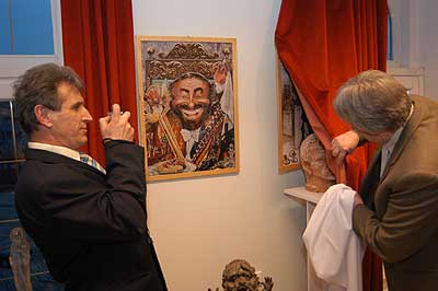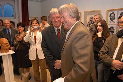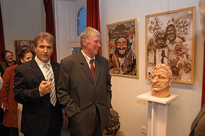 A két kiállító több meglepetéssel is készült. Először Szűcs Lajost kérték meg, hogy leplezze le az első letakart szobrot, mely éppen őt ábrázolta. Azután pedig még két alkotásra is fény derült, melyen Csíky Tóniót és Tónió Csíkyt mintázta meg. |