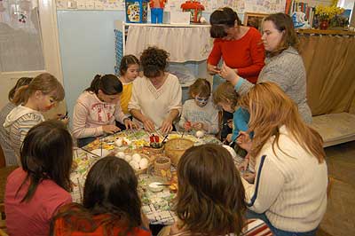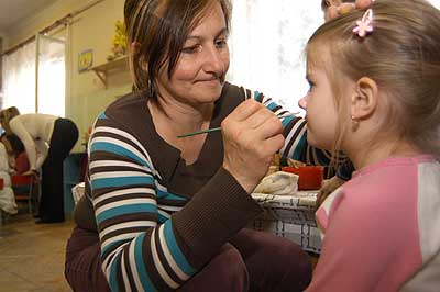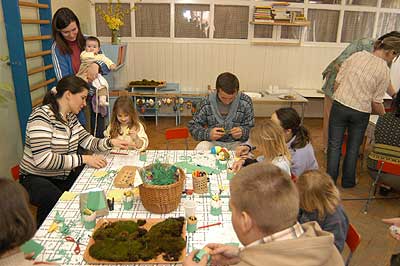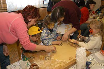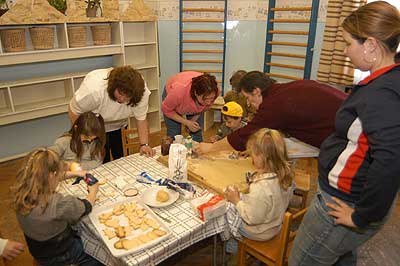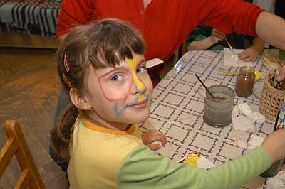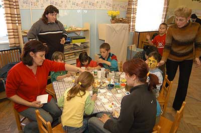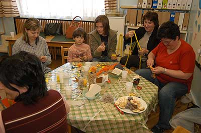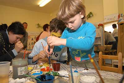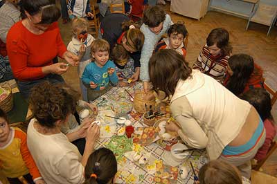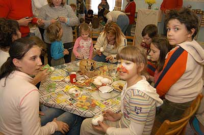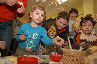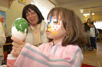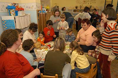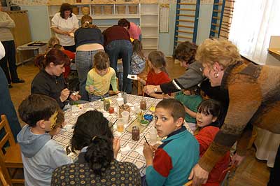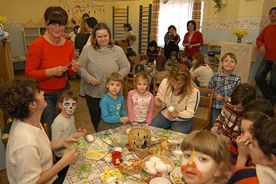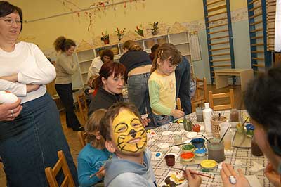2006. április 7-én "Húsvét váró kézművesnap"-ra várták a szülőket és a gyerekeket a Ruhagyári Óvodába. A gyerekek nagyon élvezték a tojás festést, amelyet nem csak a lányok festettek, hanem a fiúk is beálltak a sorba. Arcfestés során, pedig mindenki milyen mintát akart, hát persze, hogy nyuszit. Akik nem voltak "nyuszik" azok még a mézeskalács díszítést is kipróbálhatták, de más ajándéktárgyak is készültek. |