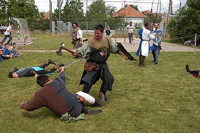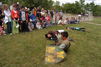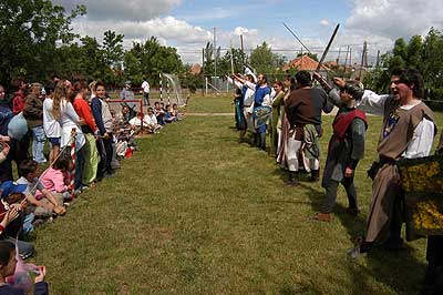 10 órakor a Zenthus János Középkori Hagyományőrző Egyesület bemutatóján az elődök harcosai lerohanták a gyerekeket de senki sem sérült meg.
