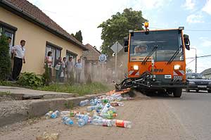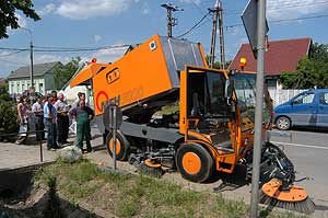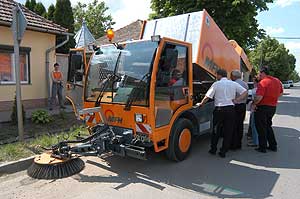Az AEBI MFH 5000 nagyteljesítményű 150 LE-s IVECO TURBO DIZEL motorral van felszerelve. Bolygóműves kormányzott első és hátsótengelyes a jármű így a legszűkebb utcákon is egy íven tud megfordulni. A lényege a cég által kifejlesztett KOANDA szívórendszer, (amit az MFH szabadalmaztatott) csaknem teljesen zárt levegő keringető rendszer: az egészségre káros finom por kibocsátást a rendszer 95 %-kal csökkenti. A robosztus szívócsonk hidraulikusan állítható a nagyobb terjedelmű hulladék felszívására így a teszt fél téglákat mind egy szálig eltüntette a gép a "gyomrába". Részletezhetnénk tovább, hogy mit is tud, de az biztos, hogy amíg eddig öt menetben sikerült eltávolítani a port az út szegélyéről, addig ez a gép mindezt egy menetben teszi meg! Ennek ellenére egy valami nem igazán tetszik a pici "sárgában", az pedig az ára! Nem sok, mert csak az eleje egy nagyobb szám, az utolsó hét számjegy csak nulla! Szentes, 2006. 05. 29. |