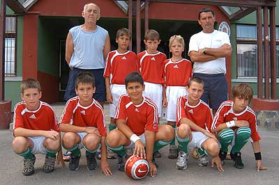 A képen látható kis csapat képviselte a szentesi iskolai utánpótlás labdarúgást a zánkai Utánpótlás Labdarúgó Táborban. A két iskolából (Koszta, Petőfi) összeválogatott csapat a megyei tornán szép eredményt ért el, így lehetőséget kaptak, hogy részt vegyenek a 2006. évben immáron harmadik alkalommal megrendezett zánkai Utánpótlás Labdarúgó Táboron, amelyet a Nemzeti Utánpótlás-nevelési Intézet támogatásával és a FONESZ közreműködésével a Magyar Labdarúgó Szövetség rendezett. A tábor évről évre szélesebb körnek biztosít lehetőséget a folyamatosan bővülő programokkal bíró eseményen való részvételre. Elsődleges célja az iskolákban, és az egyesületekben futballozó tehetséges gyermekek kiválasztása. Szentes, 2006. 07. 11. |