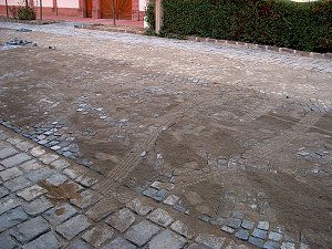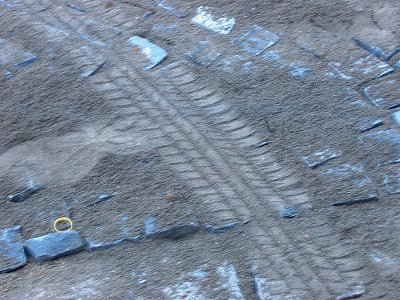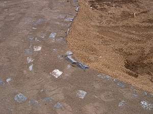 A szinusz-sablonok mentén lerakott kövek a "bakancsos turisták" lépteit is megszenvedték, ám ez még könnyen helyrehozható. Az autókerék által megnyomorított útfelületet viszont valószínűleg újra kell rakni. Szentes, 2006. 09. 04. |