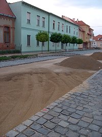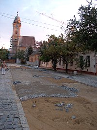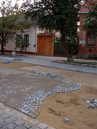 A Nagytemplom felújításával és a Református Idősek Otthona építésével párhuzamosan egyre feszesebb tempóban zajlik a Kiss Bálint utca korhű rehabilitációja is. Az arra járók érdeklődve figyelik, mennyire nem egyszerű munka a különféle méretű bazalt kockákból az út felületét kialakítani. Sajnos olyan érdeklődő is akad, aki semmibe veszi az útépítők fáradságos munkáját - ennek a nyomait rögzíthettük szeptember 3-dikán vasárnap a kora esti órákban, a mindkét végén lezárt utcában.