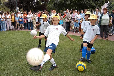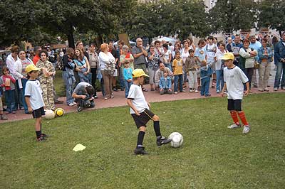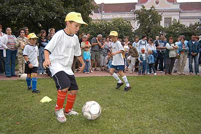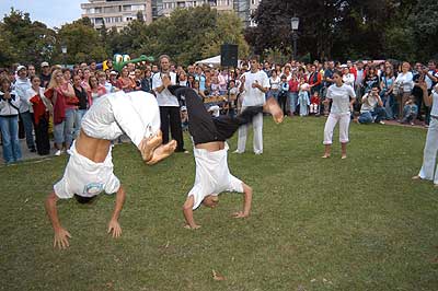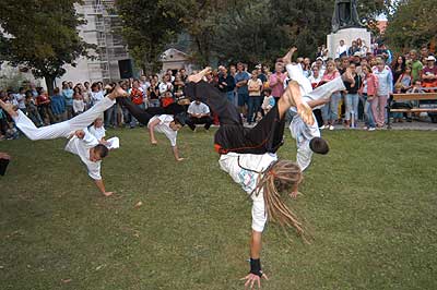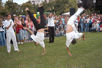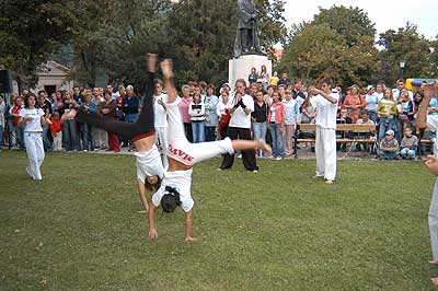 A Kossuth szobor melletti füves részen este 6-kor a Szentesi Farkasok léphettek a fűre, és itt mutatták be a fiatal focisták tudásukat. Az utánuk következő néhány percben egy acrobatikus capoeira bemutatót láthattunk. Bizonyára már többen hallottak e Magyarországon még újnak számító – de egyre nagyobb népszerűségnek örvendő -, brazil eredetű sportágról. Kialakulása az 1600-as évekre tehető, mikor is a Brazíliában élő, elnyomástól szenvedő rabszolgák tömegei folyamatos lázadásokkal keserítették meg földesuraik nyugalmát. Ekkor a nagybirtokosok arra a következtetésre jutottak, hogy mindennemű harci technika gyakorlását megtiltják szolgáiknak. A rabszolgák leleményességének köszönhető a táncos, játékos vonások. Az e fajta gyakorlás új technikát követelt. Azóta e tradíció sportággá nőtte ki magát, és ma már fegyverek nélkül, rengeteg akrobatikus látványelemekkel tűzdelve gyakorolják az emberek szerte a világon korhatár nélkül. Szentesen és még a környező 4 városban az ACROTEK SE vezetőedzője, Dömsödi Ferenc tartja a tréningeket.