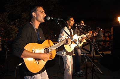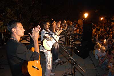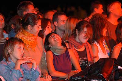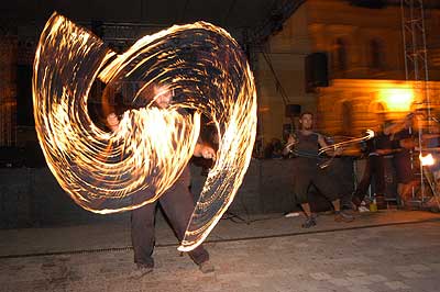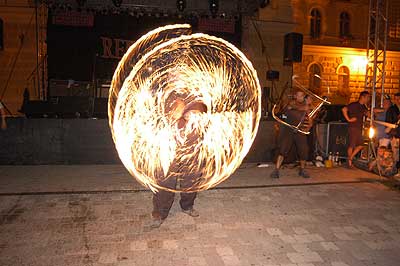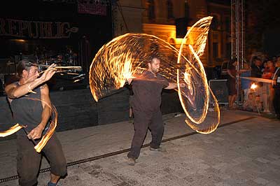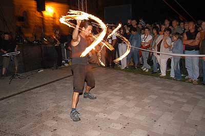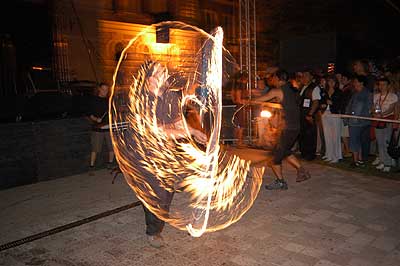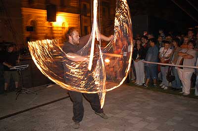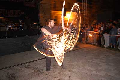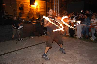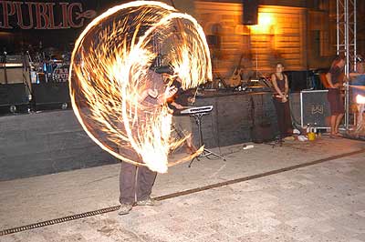 Az est sztárfellépője előtt tűzzsonglőrök kápráztatták el a közönséget, mely társulatot (Spiral Flames) Tihanyi Mihály és Retkes István keltette életre még 2002-ben. A fiúk ’99-ben ismerkedtek meg a zsonglőrködés alapjaival, majd két év elteltével beszerezték az első tüzes kellékeket: egy meteor és egy ördögpálca alkotta akkori eszköztárukat. A hobbinak indult játéknak egyre több szemtanúja akadt, majd megkezdődött a felkérések, meghívások ideje a különböző rendezvényekre. Állandóan változó műsorukat több alkalommal volt már lehetőségük bemutatni, nem egyszer több száz néző előtt. Így szerepeltek már: zenés, gasztronómiai és családi rendezvényeken, kiállítás megnyitókon, iskolai táborokban, sportprogramokon, szalagavatókon, különböző klubokban, diszkókban. Látványos tüzes műsoruk állandó vizuális eleme a Karahana zenekar koncertjeinek. A zenekar ütőse, Bugyi András kíséri műsorukat lehetőség szerint kongával, darbukán, rototamokkal vagy éppen digitális dobpaddal. Időről-időre változik a felállás. Esti fellépésükön Gila Ferenc és Pintér Hajni közös Angyalszárny számával bővült repertoárjuk. Ezen kívül buzogány, ördögbot és meteorszámokat láthattak a Spiral Flames tűzzsonglőröktől.