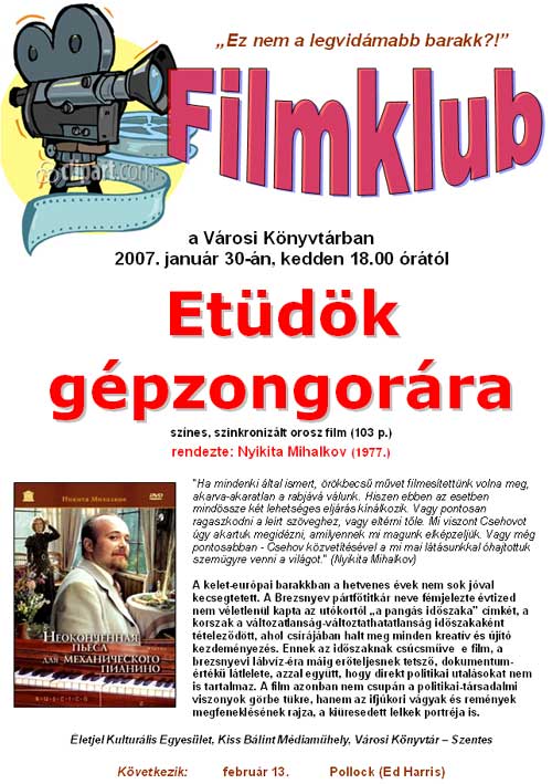 Január 30. Filmvetítés Nyikita Mihalkov: Etüdök gépzongorára