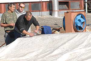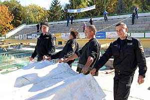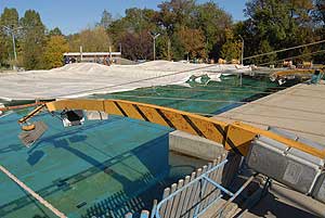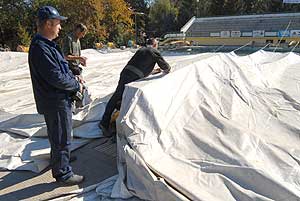 A leghosszabb ideig az tartott, míg összeillesztették a két sátorfélt. Sok száz csavarral kellett összefogatni a két részt. A tűzoltók segítségével közel húszan húzták egyik partról a másikra a sátrat, hogy csütörtöktől teljes üzemben működjön a két versenymedence. A 33-as medence forgóajtaját is felújították, így remélhetőleg jobb lesz a légtartása, valamint könnyebben lehet ki ill. bejutni rajta.