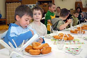 Játék után, (amelyen a nem annyira félősök békát gyűjtöttek), jött a meglepi a farsangi fánk! Szállt a porcukor, kenődött a lekvár, de a friss fánknál nincs is jobb, ami egy kis csemege volt az ebéd előtt a jelmezbe öltözött gyermekeknek.