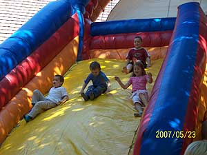 Meglepetések sora várt csemetéinkre. Az óvó nénik színes szalagokkal, léggömbökkel díszítették az ovi udvarát, hogy mindenki tudja, gyermeknap van az oviban. Zenés tornával melegítettünk be az ugrálóvár használatához, mely igazi meglepetés volt. A csúszdás ugrálóvár folyamatos megrohamozása reggel 9-től, délután 16 óráig tartott. Az ebéd elfogyasztásával gyűjtöttek a gyerekek újabb energiát.