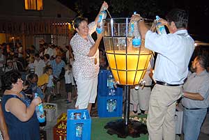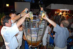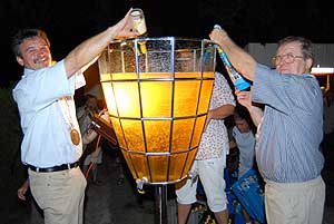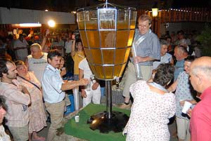 Tóth Imre a lovagrend nagymágocsi tagja készítette a hitelesített 236 liter űrtartalmú poharat, melyhez több rekord tartozik (pl. a legnagyobb adag málnaszörp is ebben készült). A poharat 2006. augusztusában avatták fel 206 literes habzó borral a győri fröccs fesztiválon, majd ezt a Guiness rekordot később kecelen 220 literre módosították. Nagymágocson (2007. július 21-én) 200 liter fröccs készült cserszegi fűszeres borból és szódavízből, némi jég hozzáadásával a rekord pohárban. Napnyugta után öntöttek fel - na nem a garatra, hanem a pohárba - és két óra múlva már csak a fele volt meg, melyet a hajnalig mulatók egész este kóstolhattak. Szentes, 2007. 07. 23. |