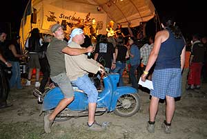 A vazelinfutás célja egy pofa sör volt. Egy 15 méter hosszú gumiszőnyeget jól megöntöztek több liter mosogatószerrel. A vállalkozó kedvű derekára rákötettek egy gumikötelet, amelynek másik végét egy fához erősítették. A sört elhelyezték a szőnyeg másik végére, s a delikvensnek futva kellett megszereznie. A közönség óriási derültségére a próbálkozók hatalmasakat estek a csúszós talajon. A találkozón egy daru is szerepet kapott. Nem a sárból emelte ki az esetleg elsüllyedt mocikat, hanem ezzel biztosították a sörösrekeszmászókat. A feladat először egyszerűnek tűnt: a versenyző biztosítókötelet használva egymás tetejére rakta a rekeszeket, s így jutott egyre feljebb. Átlagosan 8-10 rekesznél dőlt le a torony, de a csúcs 22 volt.