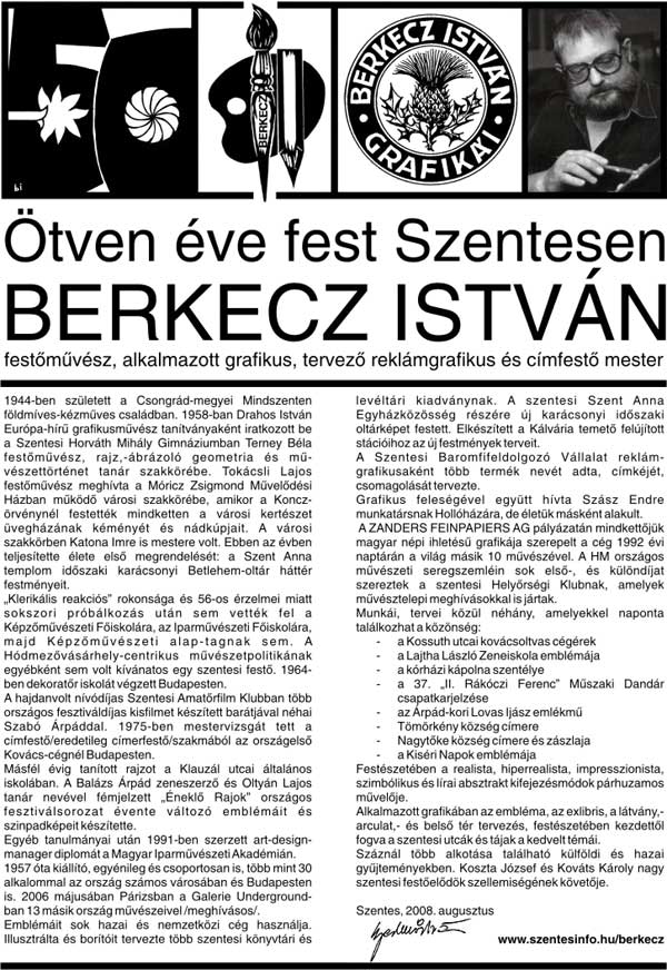 2008. október 15-én a Városi Könyvtárban hallhattunk beszélgetést Berkecz István festőművésszel, aki 50 éve fest Szentesen. Beszélgető társa Oltyán Lajos volt, aki közöz emlékeken keresztül mutatta be a művészt.