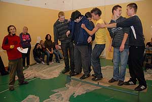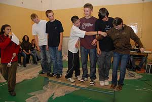 Erre a padra kellett felállni hat főnek össze-vissza, majd indulhatott a tornasorba rendeződés. Ezt úgy kellett végrehajtani, hogy senki nem léphetett le a padról, szóval vagy átugorta vagy átmászta magát a diák a helyére, vagy egyszerűen ölben átemelték egymást. Próbálkozni csak egyszer lehetett és aki lelépett, attól a pillanattól nem járt pont a feladatért.