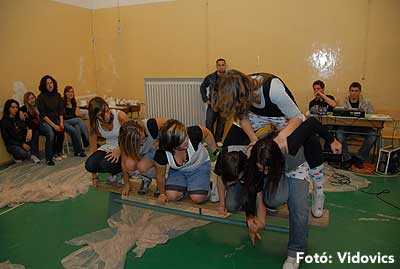 Erre a padra kellett felállni hat főnek össze-vissza, majd indulhatott a tornasorba rendeződés. Ezt úgy kellett végrehajtani, hogy senki nem léphetett le a padról, szóval vagy átugorta vagy átmászta magát a diák a helyére, vagy egyszerűen ölben átemelték egymást. Próbálkozni csak egyszer lehetett és aki lelépett, attól a pillanattól nem járt pont a feladatért.
